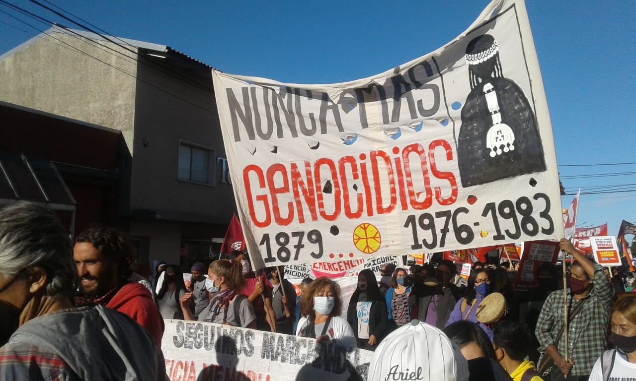 De esta manera, el movimiento mapuche encuentra una relación directa entre el “genocidio fundante del Estado” y “el genocidio de la última dictadura militar”. Busca ampliar la temporalidad que dice que entre 1976 y 1983 ocurrió un genocidio en la Argentina y reivindica que el “genocidio continúa”, haciendo hincapié en las consecuencias de ese genocidio y cómo opera hoy un tipo de genocidio. Es decir que aquí el concepto aparece no como una categoría jurídica o académica, sino como una categoría social apropiada al calor de la lucha. De esta manera también lo explica Gustavo Marín al referirse a una bandera elaborada por el espacio de militancia mapuche al que pertenece, en la que aparece inscrita la consigna “nunca más genocidios”: