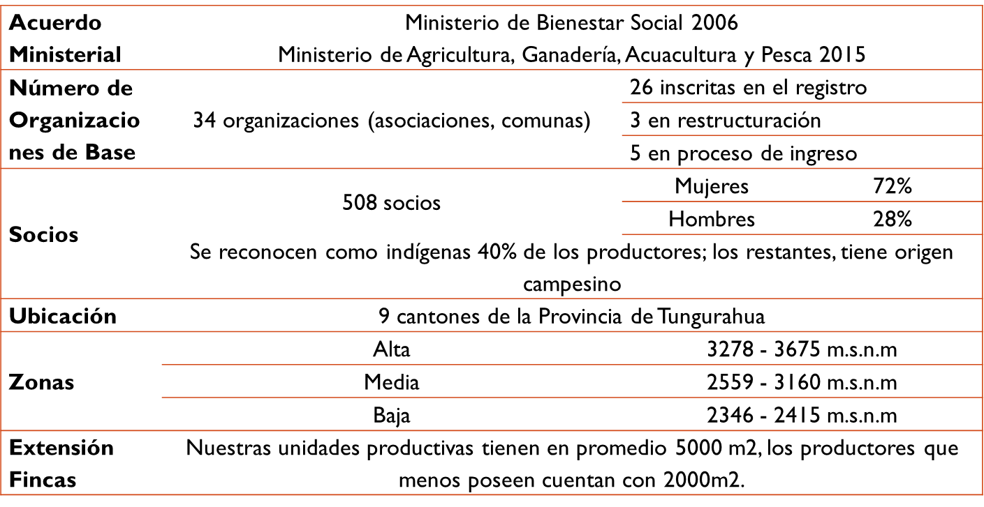 Entre los aspectos sociales y culturales, la organización alberga a más de 120 familias, que a la vez se constituyen en beneficiarios directos quienes además participan activamente en las iniciativas y espacios de decisión de la organización. La composición por género en la organización tiene el registro que identifica que un 66 % serían mujeres y el restante 34 % compuesto por hombres, visibilizando de esa manera una sobresaliente participación de mujeres tanto en los procesos de producción como de comercialización. Asimismo, desde la perspectiva de la adscripción a las identidades étnica / culturales, los datos señalan la existencia de un 40 % de agricultores que se reconocen como indígenas y el porcentaje restante se reconoce como descendiente de familias indígenas (Contreras 2016; PACAT 2018)