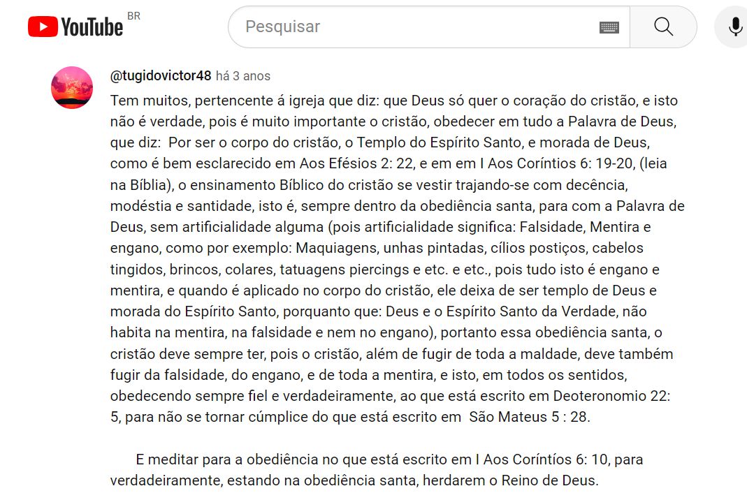 O vídeo intitulado “Retratos de fé” (código 01 na tabela) é um documentário produzido pela TV Cultura para um programa do canal aberto onde são apresentadas as principais características do tambor da mina do Maranhão. Este vídeo mostra e explica vários elementos da teologia mineira. Entre os 96 comentários, chamamos a atenção para um longo comentário escrito por @tugidovictor48 onde nos deparamos com ensinamentos bíblicos e livros referentes à moral cristã. Este comentário nos faz perceber que um Cristo convida os mineiros a se converterem ao cristianismo, para que esses afro-religiosos obtenham a salvação.