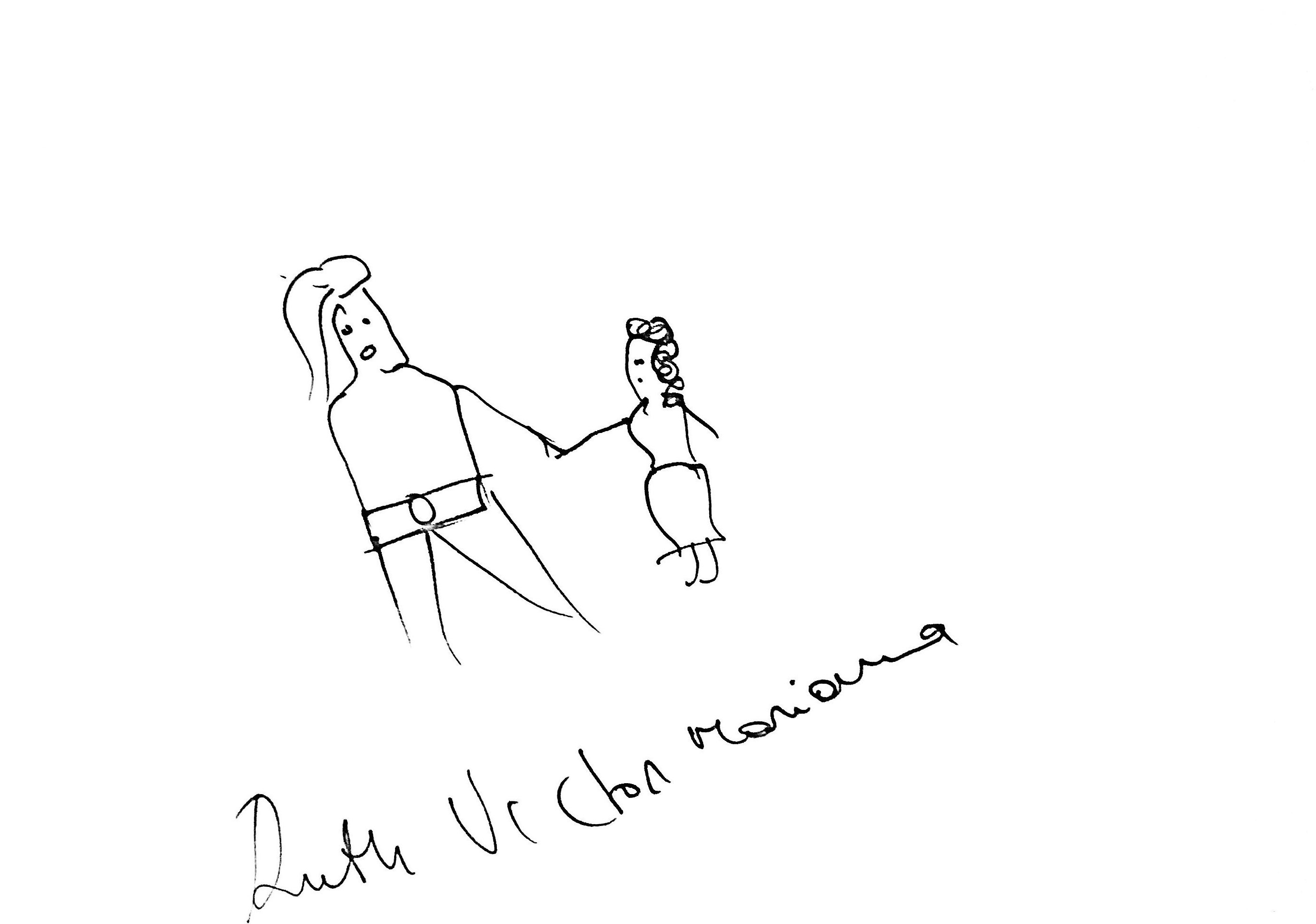 Pedi para a Ruth que fizesse um desenho para a personagem do livro que havíamos acabado de ler. Ela fez dois. No primeiro, desenhou o pai da menina de mão dada com ela. Ruth explicou que a ideia que teve foi dele já no Brasil, passeando com a filha. O segundo é sobre o dia em que a menina, o pai e a mãe voltam para a África e encontram o restante da família fazendo comida.