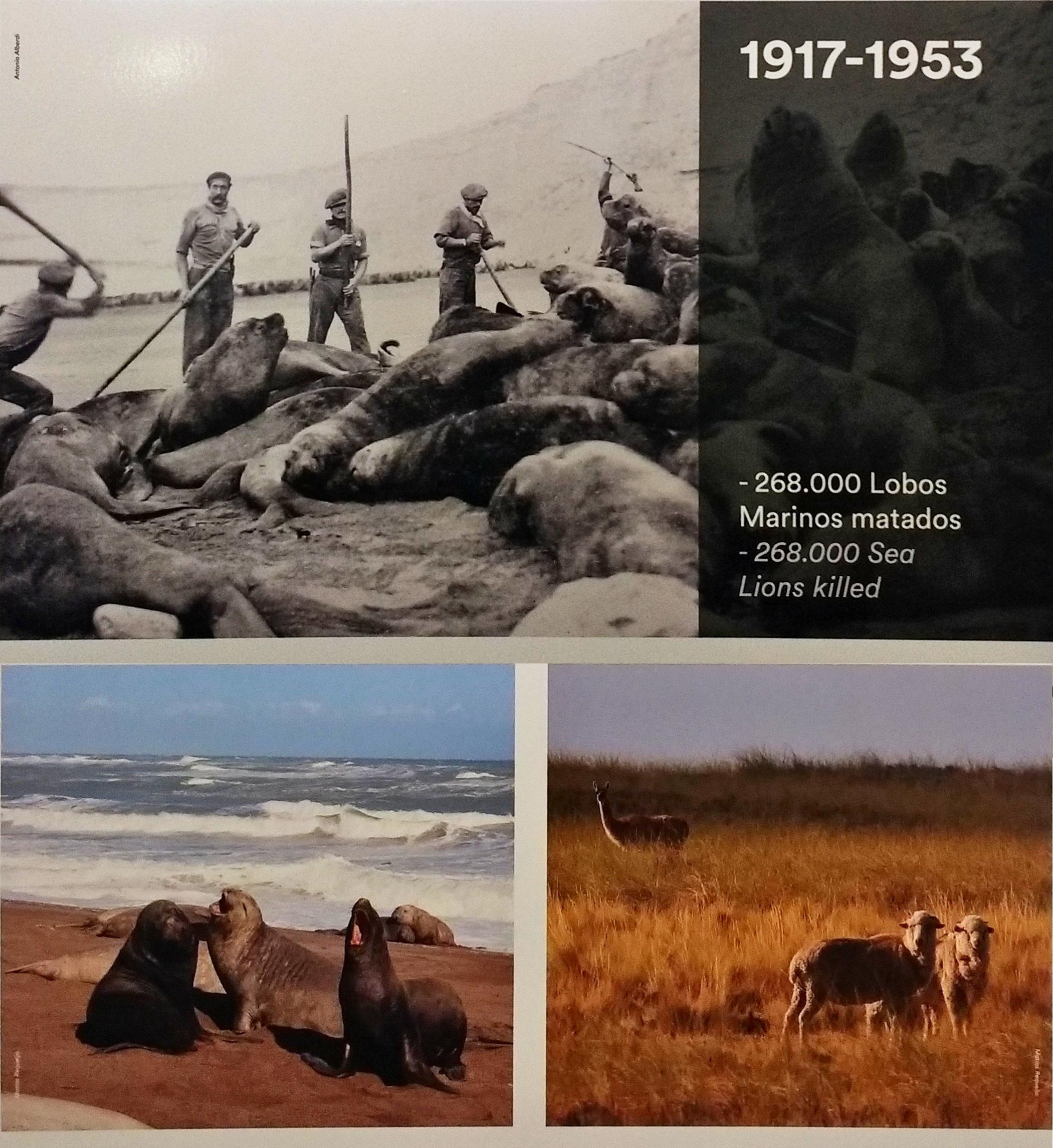 La caza de lobos marinos fue autorizada por ley desde 1914 para su explotación a escala industrial y prohibida desde 1958. El poster alusivo a esta actividad se refiere a la misma como “alternativa o complementaria”, aunque no aclara alternativa de qué, dado que en 1920 la  industria salinera ya había desaparecido. También menciona que era una actividad autorizada por ley nacional, que tuvo su apogeo entre los años de 1917 y 1953, que se utilizaba principalmente la grasa para el aceite y el cuero para la talabartería, y, en lo siguiente sí son muy específicos, que en ese período se registraron más de 268.000 lobos matados en Península Valdés.