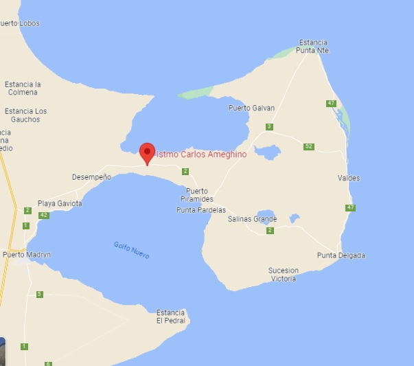Península Valdés se encuentra en el noreste de la provincia de Chubut, República Argentina. Limitada al sur por el Golfo Nuevo, al norte por el Golfo San José y al este por el océano Atlántico, se une al territorio nacional a través de un estrecho istmo que en su punto más angosto tiene apenas 7 km de ancho. Es el Istmo Carlos Ameghino, nombrado así por quien se dedicó a explorar la Patagonia desde el año 1887 y quien forjaría, junto a su hermano Florentino, las bases de la paleontología argentina..