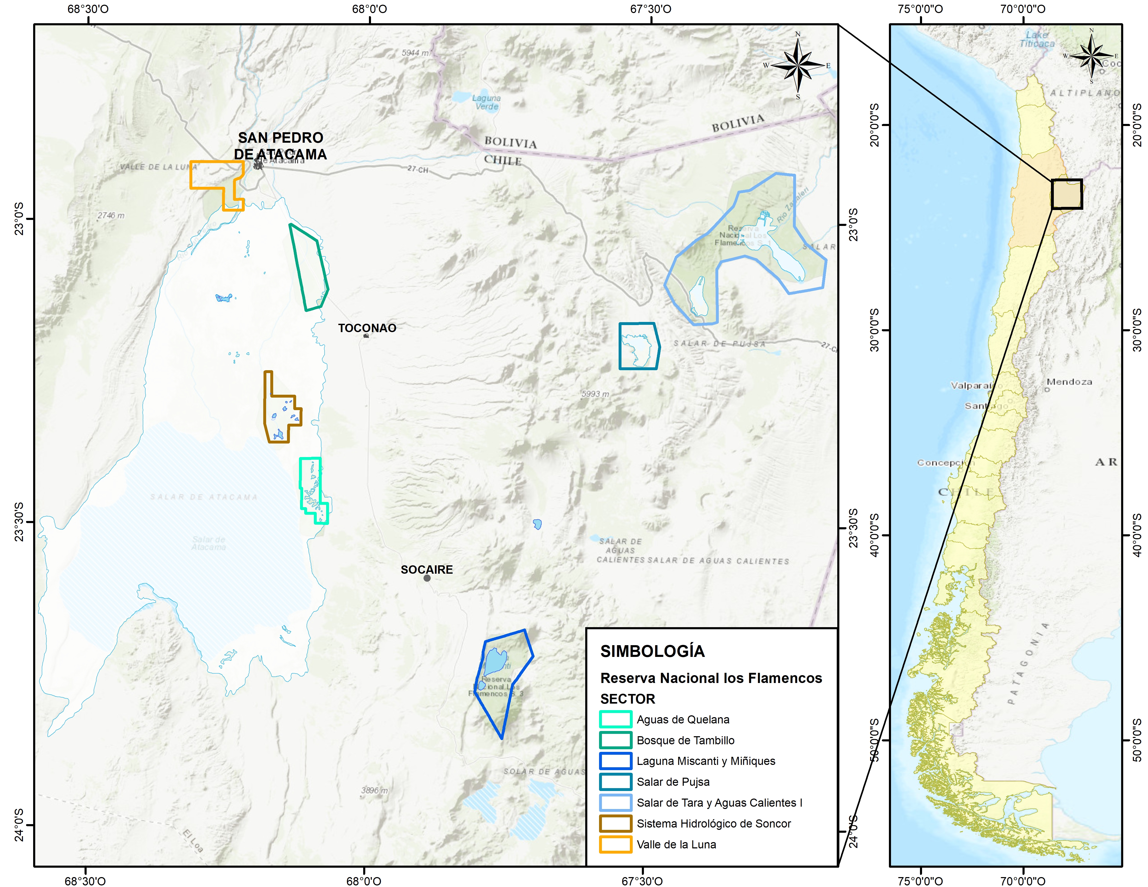 La Reserva Nacional Los Flamencos (Figura 1), inscrita en el SNASPE, está constituida por seis unidades que cubren aproximadamente 74.000 hectáreas. Comprende los salares de Atacama, Tara, Aguas Calientes y Pujsa, las lagunas de Chaxa, Miscanti y Miñiques, la quebrada de Soncor, el Valle de la Luna y el bosque de Tambillo.