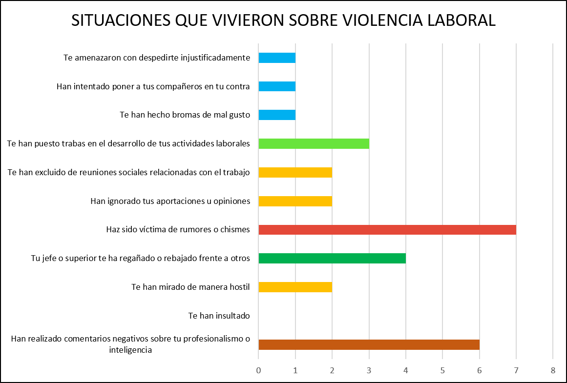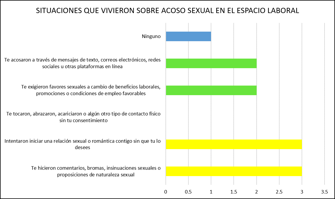 estos cuadros se encuentran en anexos. En estos cuadros, es evidente que, en lo que respecta a la violencia de género, todas las personas se encontraron con alguna manifestación de violencia de género en su entorno profesional durante su permanencia en el sector público. Concretamente, las transgresiones más frecuentes fueron los casos en los que se denigraron sus contribuciones, se negaron sus puntos de vista y se involucraron en actos de intimidación o amenazas. Del mismo modo, en lo que respecta al acoso sexual, los actos que afectaban predominantemente a las compañeras eran los comentarios, las bromas, las proposiciones o insinuaciones sexuales y los intentos por establecer una relación sexual o romántica sin su consentimiento. Por último, en cuanto a la violencia relacionada con el espacio laboral, la mayoría coincide en que la forma más recurrente de violencia que sufren es la propagación de rumores y chismes que empañan su reputación como mujeres.