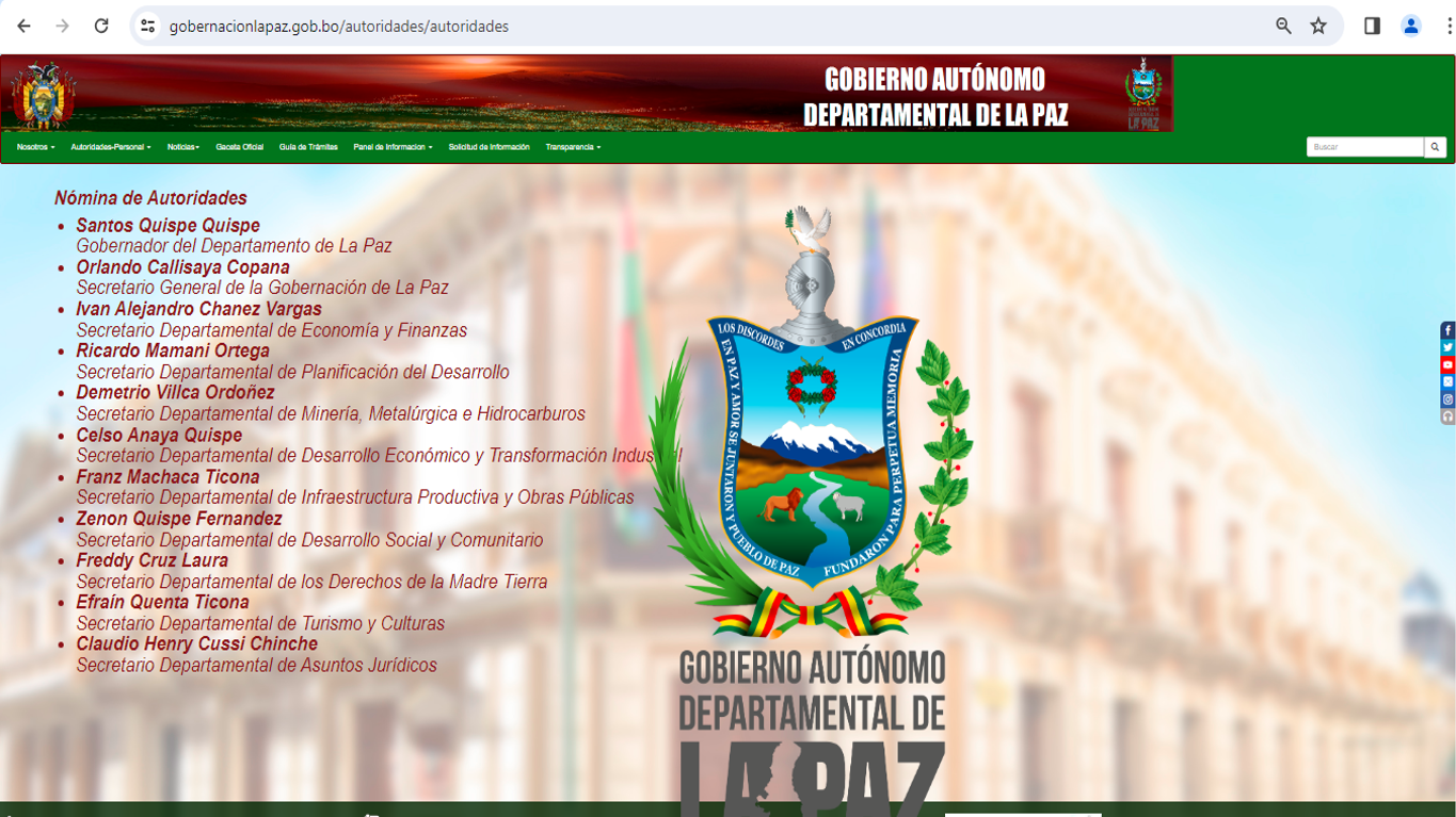 ·         Gobierno Autónomo Departamental de La Paz. (2024). Nómina de Autoridades. Gobierno Autónomo Departamental de La Paz. https://www.gobernacionlapaz.gob.bo/autoridades/autoridades