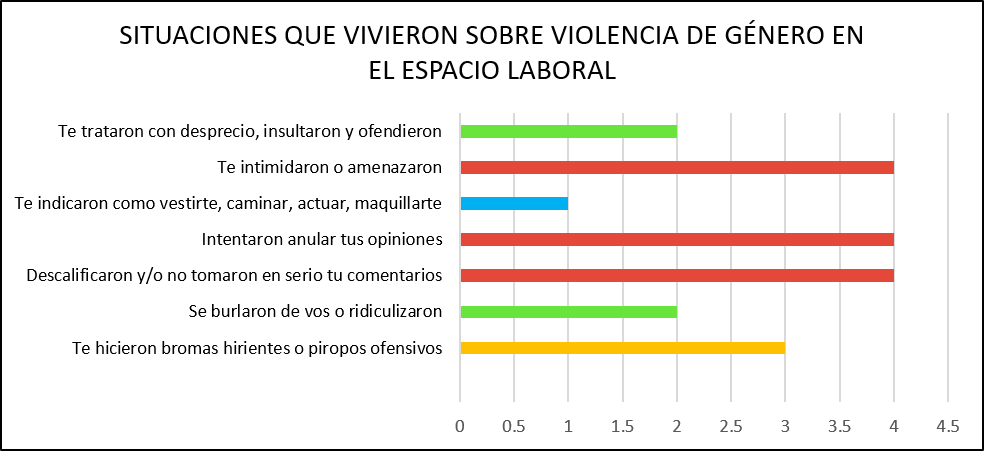 Así también, se construyeron cuadros complementarios en los que las compañeras eligieron las alternativas que resonaban con sus experiencias personales de acoso sexual, violencia de género y violencia laboral,